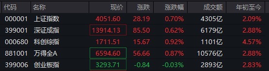【大河财立方 记者 任浩鹏】1月6日,A股三大股指开盘后持续拉升,截至10:10发稿,沪指涨超0.7%,盘中突破2025年11月14日的阶段高点4034.08点,刷新2015年7月底以来的新高。深证成指涨超0.6%,创业板指震荡较明显,一度涨超0.5%后飘绿。全市场超过4000只个股上涨。