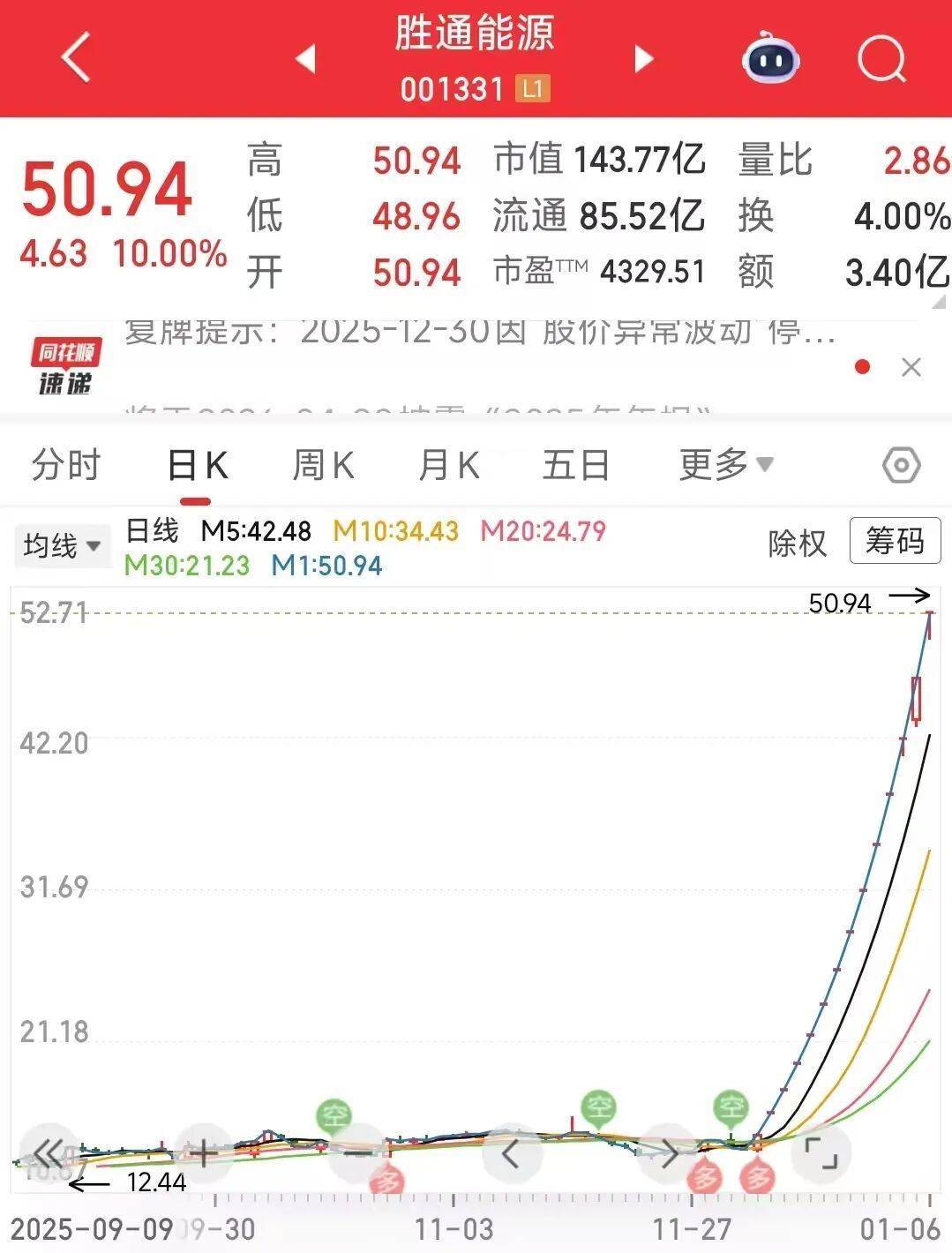 值得关注的是,前期大牛股胜通能源今日复牌后再度涨停,连板数“12+1”。消息面上,1月5日晚间,胜通能源公告称,停牌期间,公司就股票交易波动情况进行了核查。公司未发现近期公共传媒报道了可能或已经对公司股票交易价格产生较大影响的未公开重大信息。同日,胜通能源公告称,截至本公告披露日,收购方七腾机器人已将要约收购保证金合计1.12亿元存入证券登记结算机构指定的账户。
